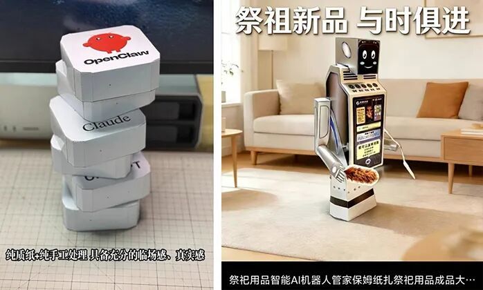 不少电商平台上线了名为“AI纸扎全家桶”的创意祭品,涵盖ChatGPT、DeepSeek、Claude(OpenClaw)、Gemini等热门AI模型的一体机造型纸扎,售价35.9元起,支持定制与立体发货。部分商家还推出智能AI机器人管家等新品,被网友戏称为“让太爷太奶也跟上AI时代”。